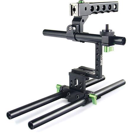a complete video production rig. It consists of a 15mm rod baseplate, half-cage, top handle, and a pair of 11.87″ long 15mm rods